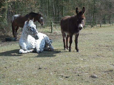 Masie, geb. 1988 Knappstrupper Stute aus Dänemark 1991 importiert. Daneben Rigoletto unser Esel geb.20.06.2007 und im Hintergrund Arkis geb. 1997 ein Appalooser Haflinger